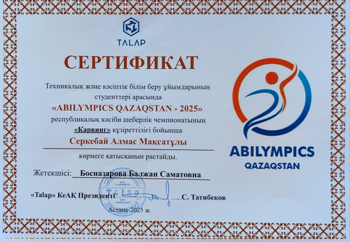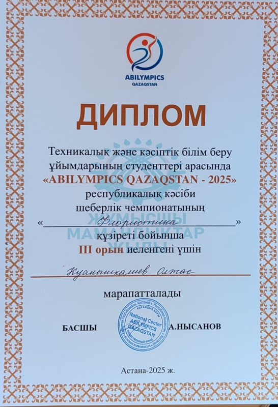 2025 жылдың 17–18 қазанында Астана қаласында ерекше білім беру қажеттіліктері бар жастарға арналған «Abilympics–2025» республикалық кәсіби шеберлік чемпионаты өтті. Бұл байқауда колледжіміздің талантты студенттері жоғары нәтиже көрсетіп, өнерлерімен көпшілікті тәнті етті: