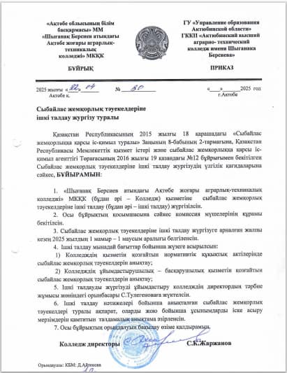 Сыбайлас жемқорлық тәуекелдеріне ішкі талдау жүргізу туралы бұйрық